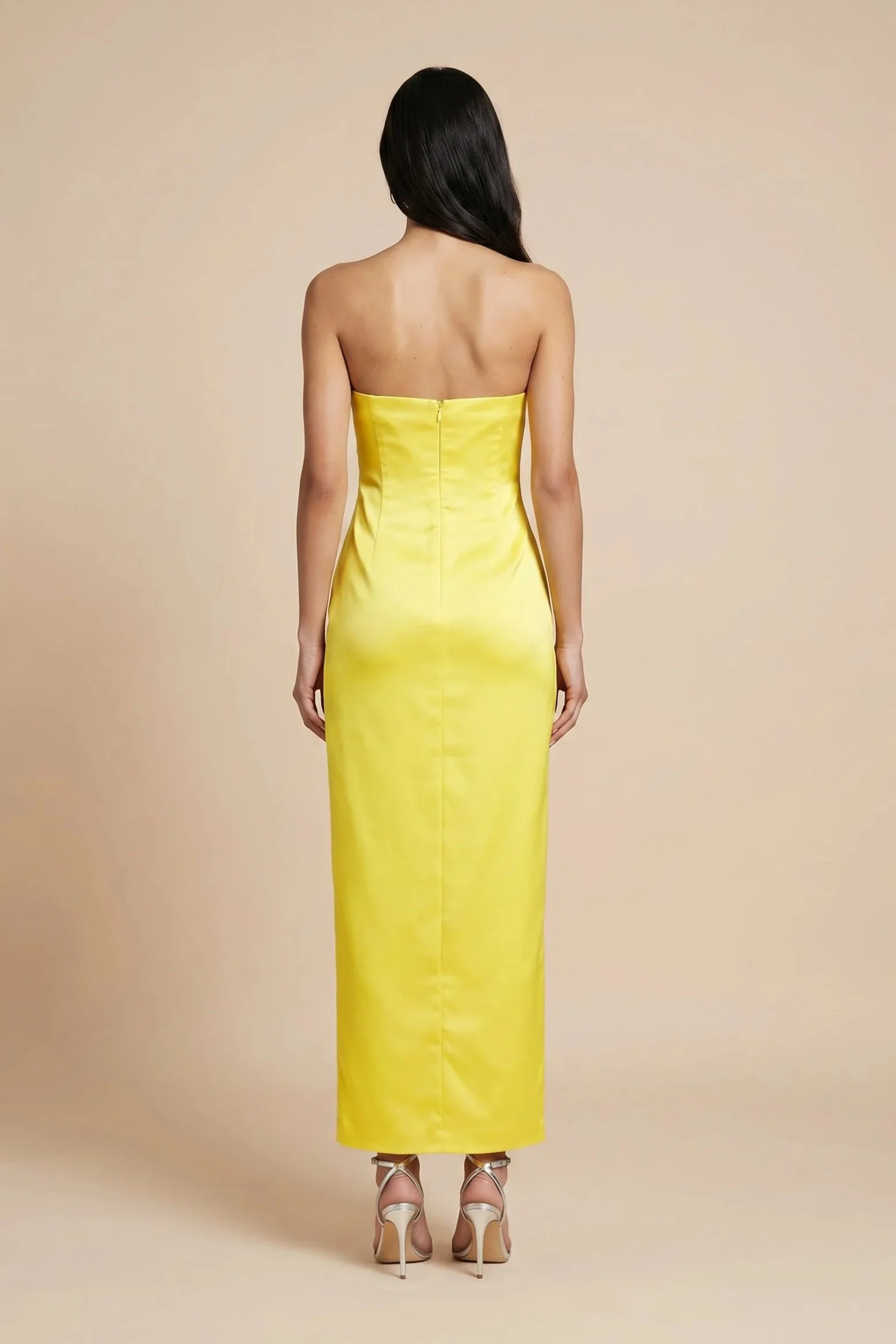 Λεπτομέρειες: Μονόχρωμο σχέδιο με απλικέ και διακριτικά κρύσταλλα, σατέν φινίρισμα, πλαϊνό σκίσιμο, ανοιχτή πλάτη, λογότυπο brand